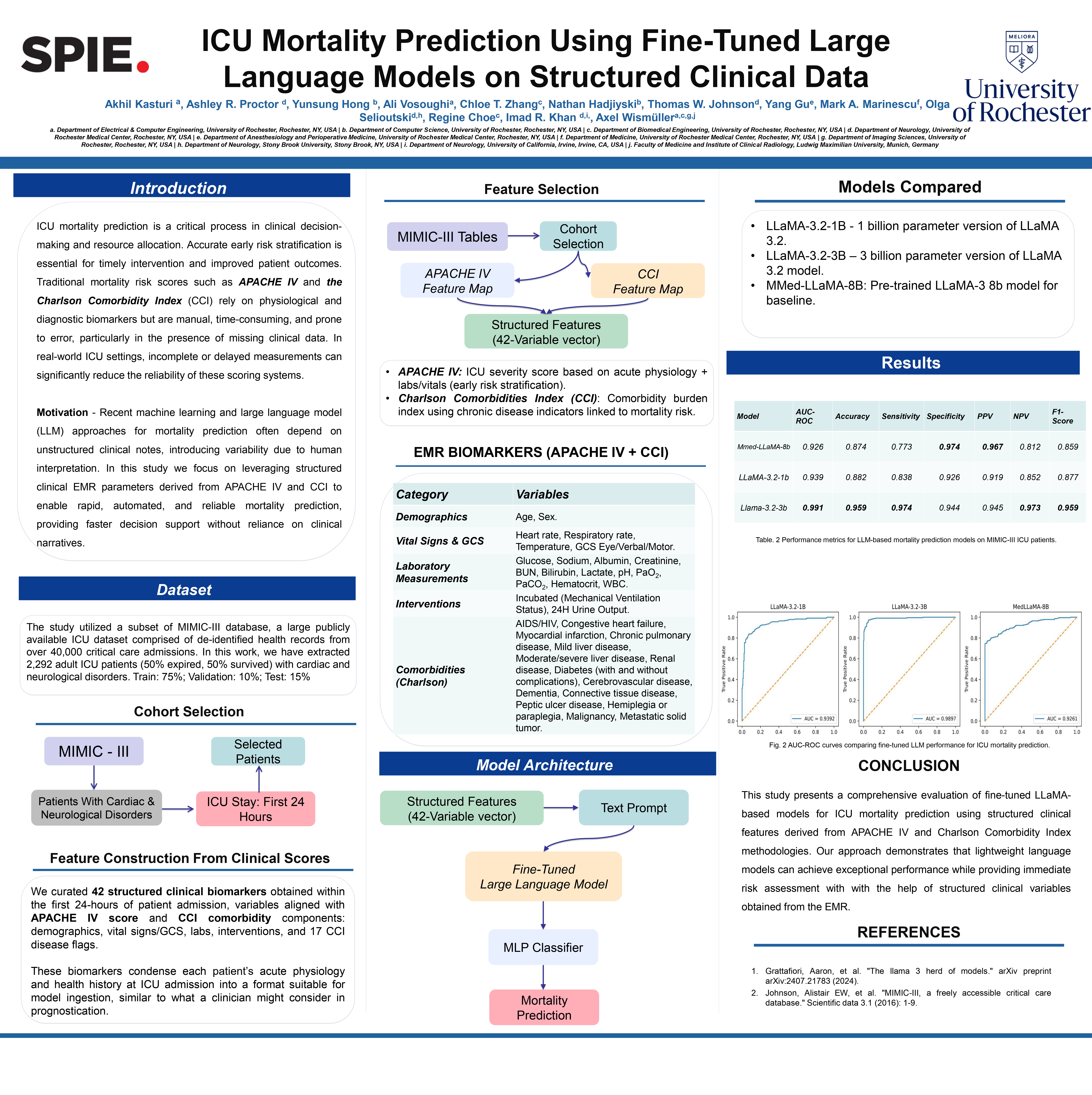 Presented poster on fine-tuned LLaMA-based large language models trained on structured tabular variables for rapid, actionable risk stratification from patient records.